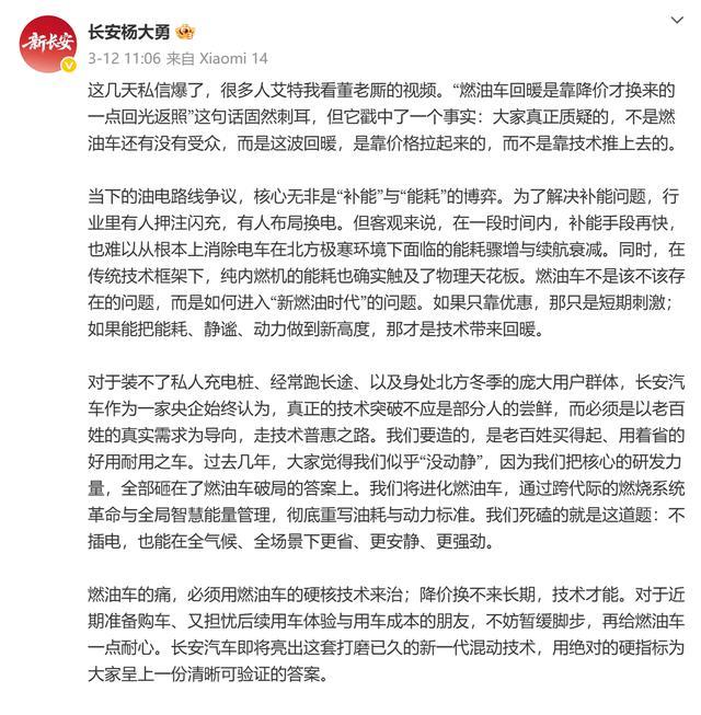现在燃油车市场的玩法,基本是靠降价撑着。但降价这条路,谁也走不长远。长安高管杨大勇有句话说得直白:“燃油车的痛,必须用燃油车的硬核技术来治。”