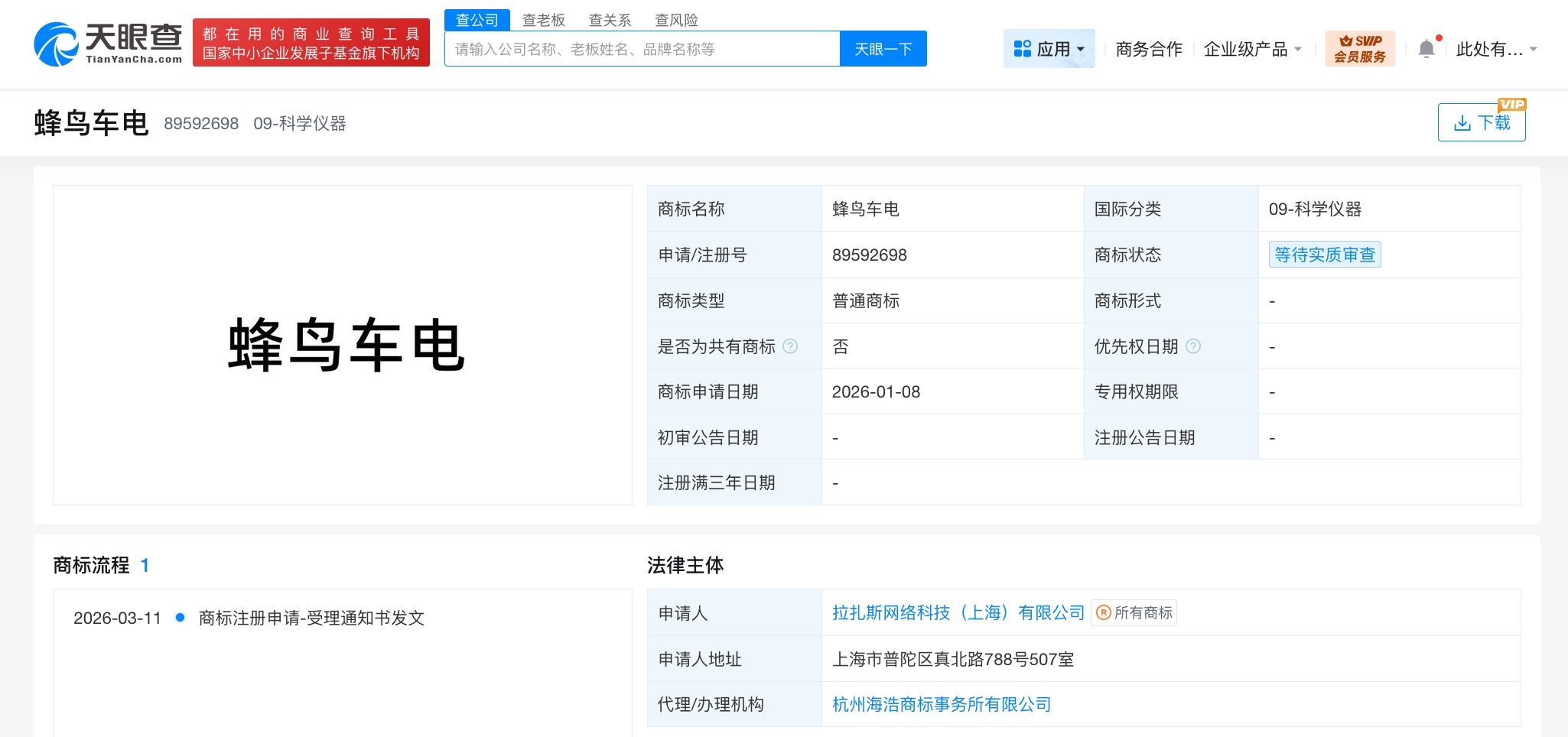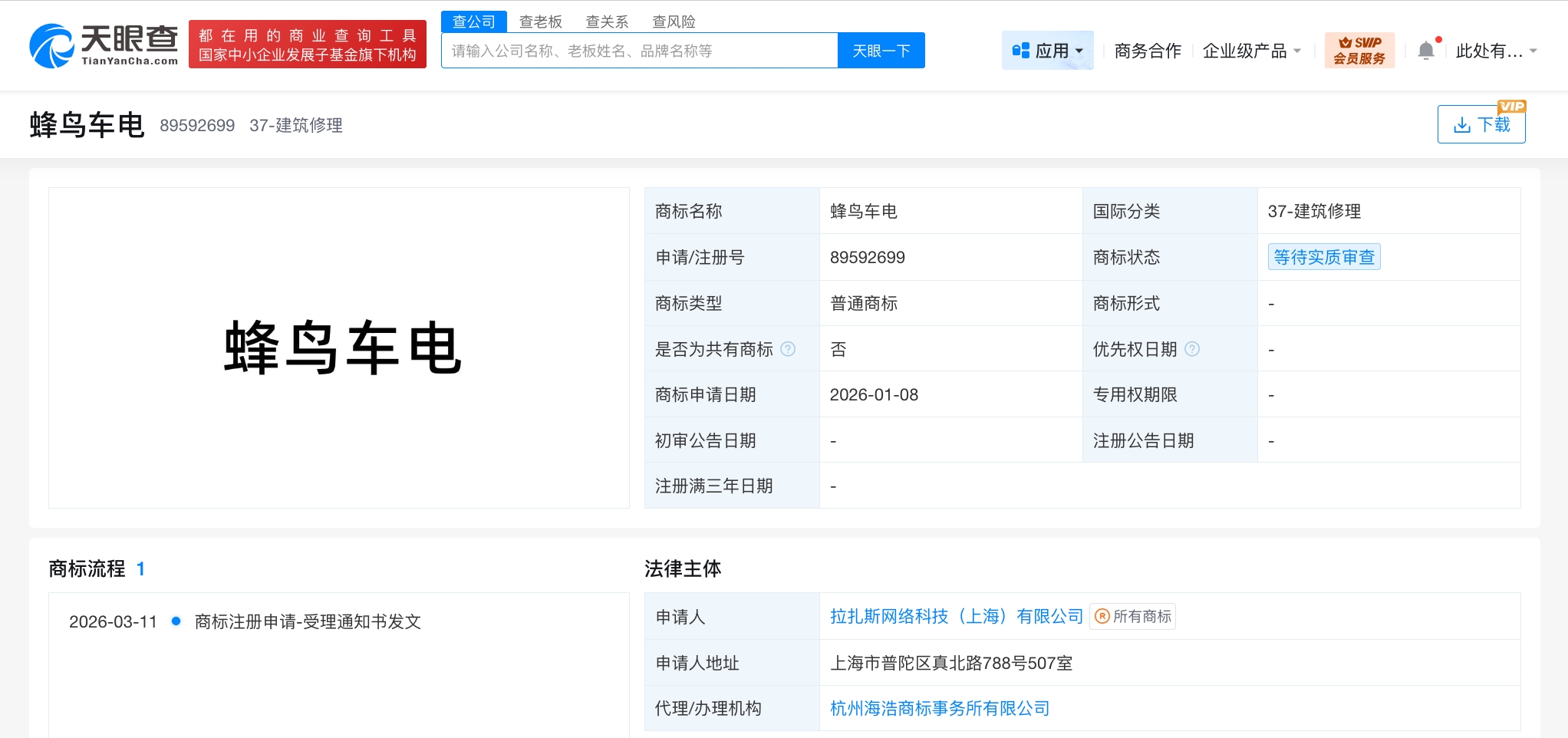 天眼查知识产权信息显示,近日,淘宝闪购关联公司拉扎斯网络科技(上海)有限公司申请注册4枚“蜂鸟车电”商标,国际分类涉及科学仪器、建筑修理、材料加工等配资在线机构论坛网,当前商标状态均为等待实质审查。